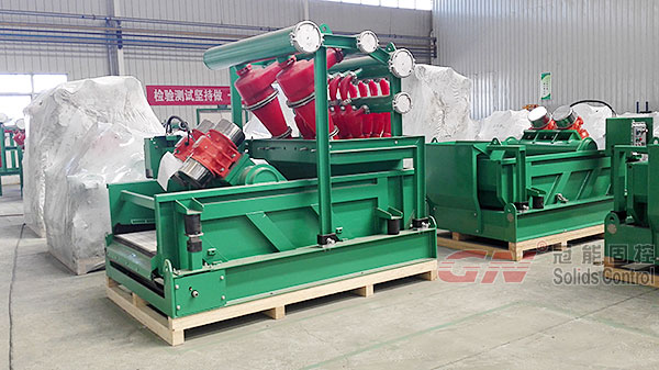 3 臺GNZS594J-2S12N泥漿清潔器。 冠能的除砂除泥一體機(jī)是由兩個十英寸的除砂旋流器、十二個四英寸的除泥旋流器和一臺GNZS594底流篩組成。這款泥漿清潔器的工作性能比不配備底流篩的單獨除砂器、除泥器處理效果好。